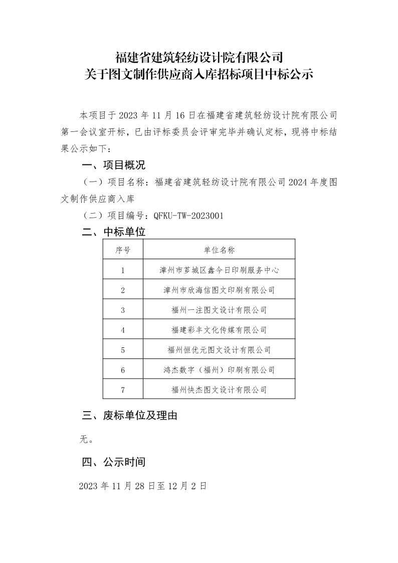 福建省建筑輕紡設(shè)計(jì)院有限公司關(guān)于圖文制作供應(yīng)商入庫(kù)招標(biāo)項(xiàng)目中標(biāo)公示